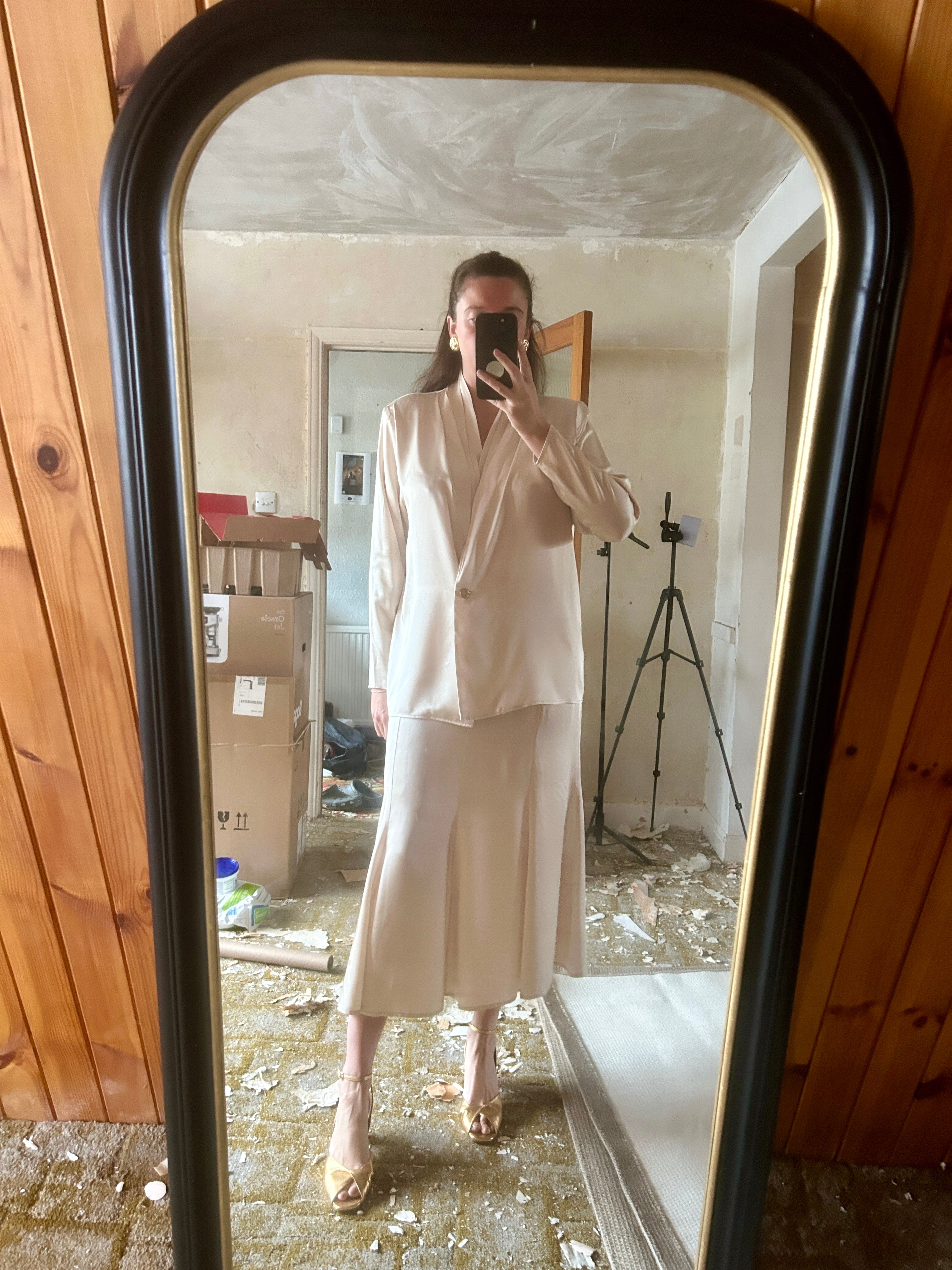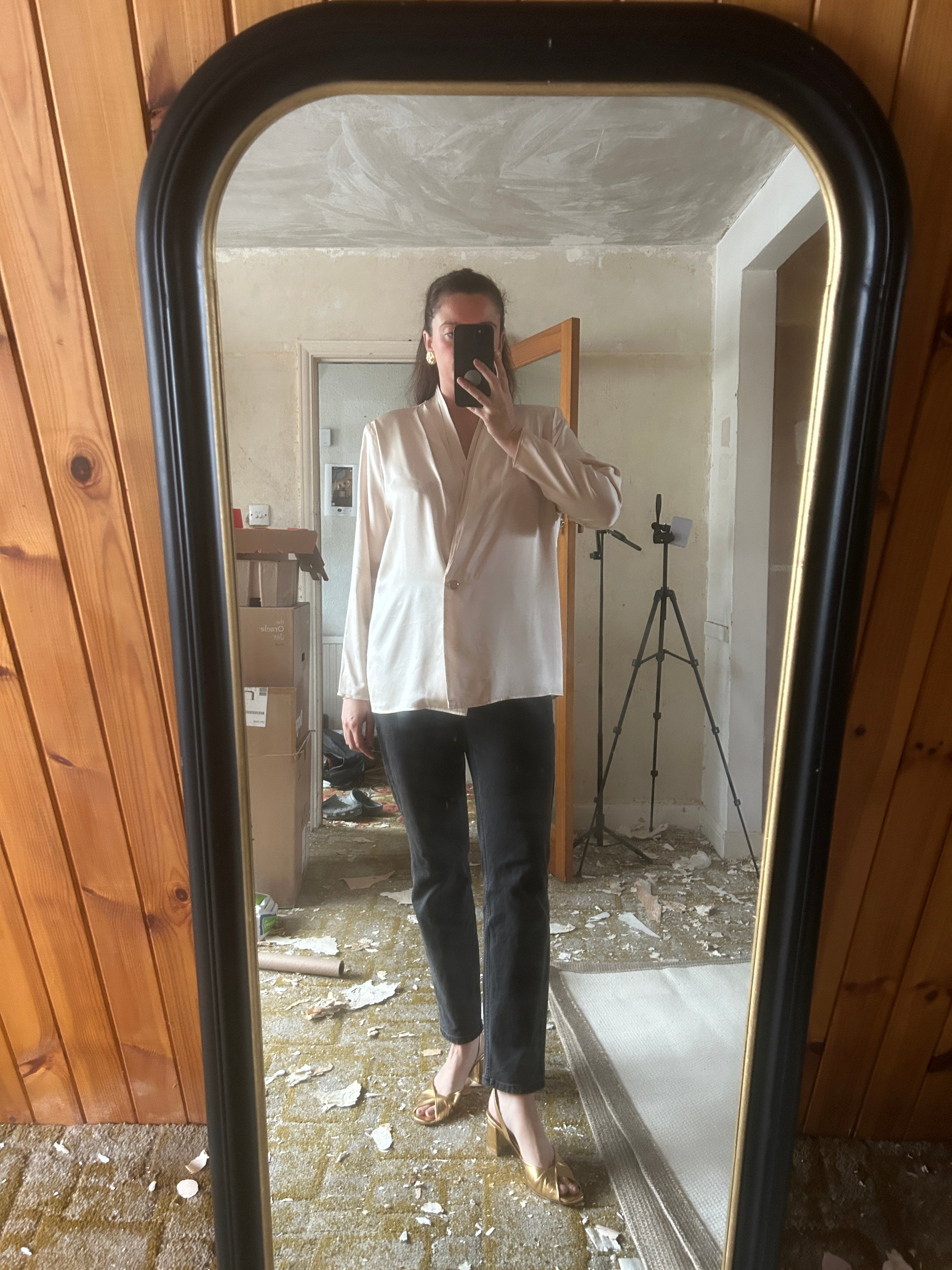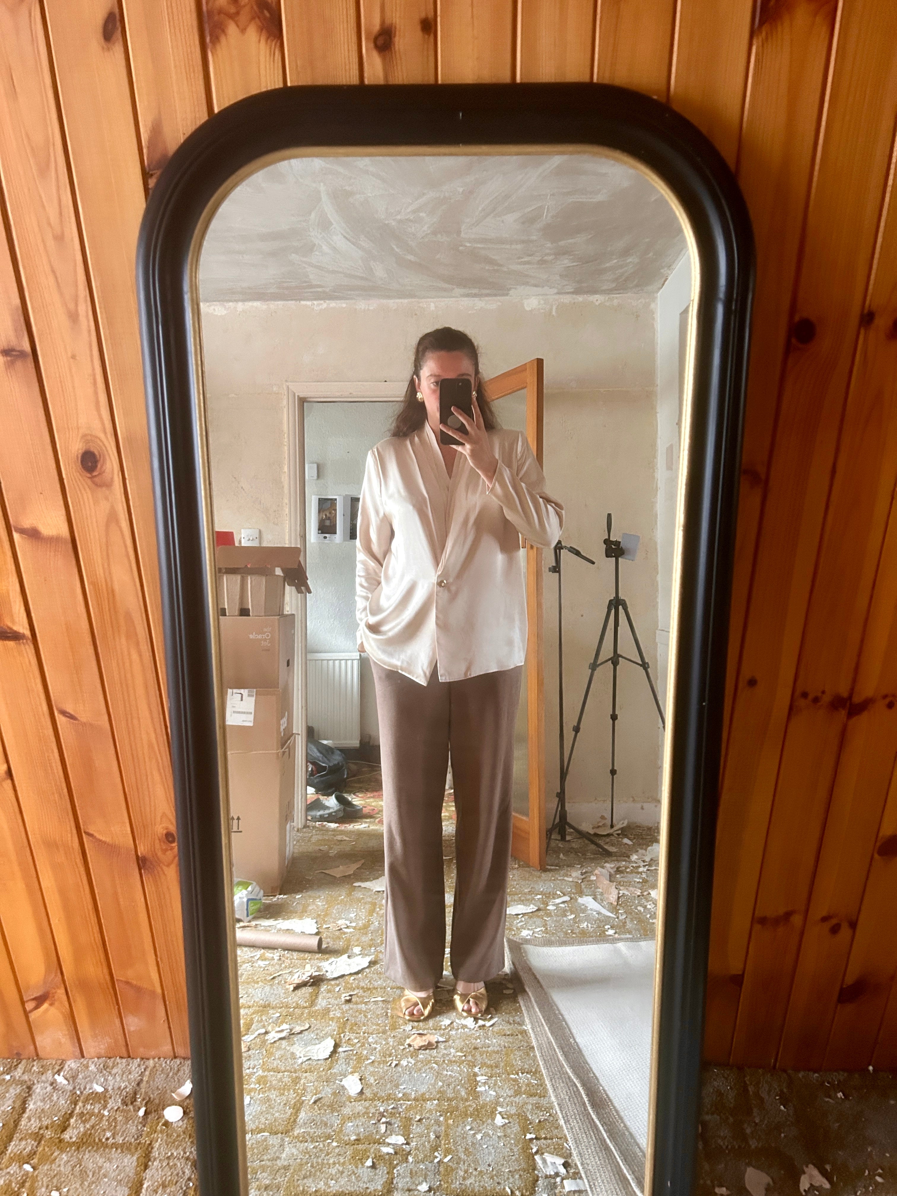 Keeping it comfy with lounge trousers and gold heels, ready for any dinner or family gathering.